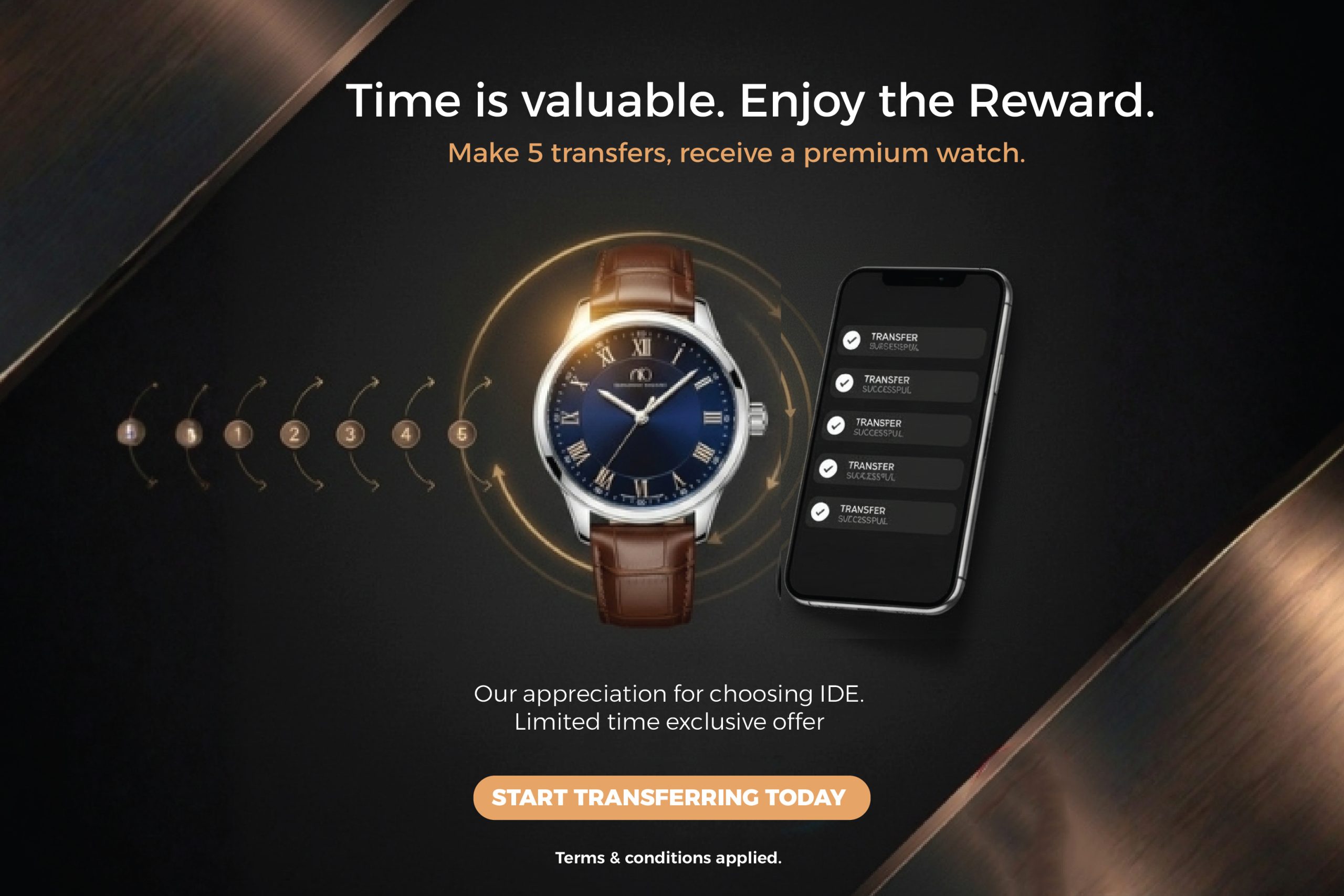 قم بإجراء 5 تحويلات مالية عبر مؤسسة التبادل الدولي للتنمية واحصل على ساعة مميزة كهدية تقدير لاختيارك خدماتنا. لا تفوّت هذا العرض الحصري لفترة محدودة.