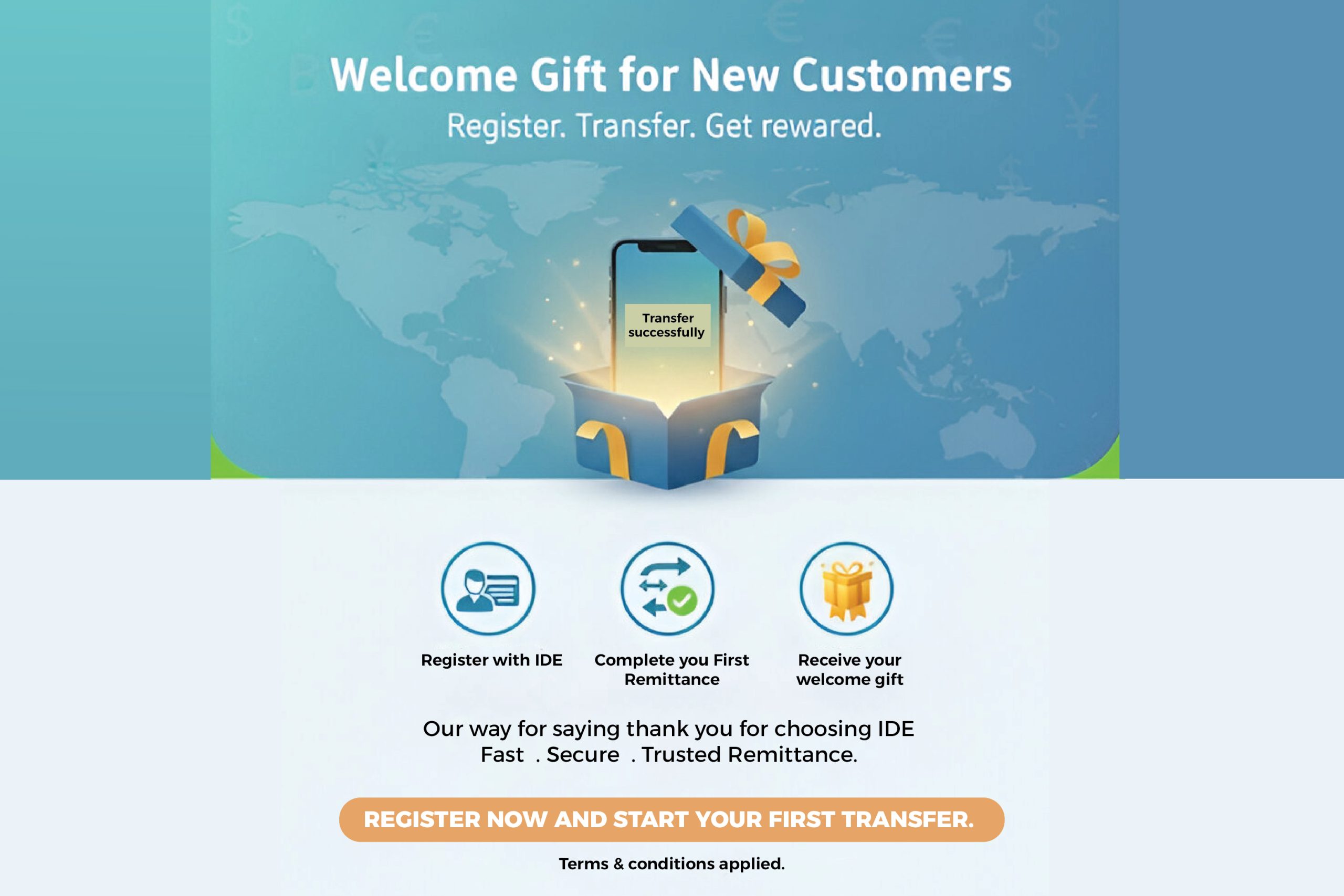 في مؤسسة التبادل الدولي للتنمية، كل عميل رابح. سجّل معنا وأكمل أول عملية تحويل أموال لتحصل على هدية ترحيبية قيّمة كعربون شكر لاختيارك مؤسسة التبادل الدولي للتنمية.